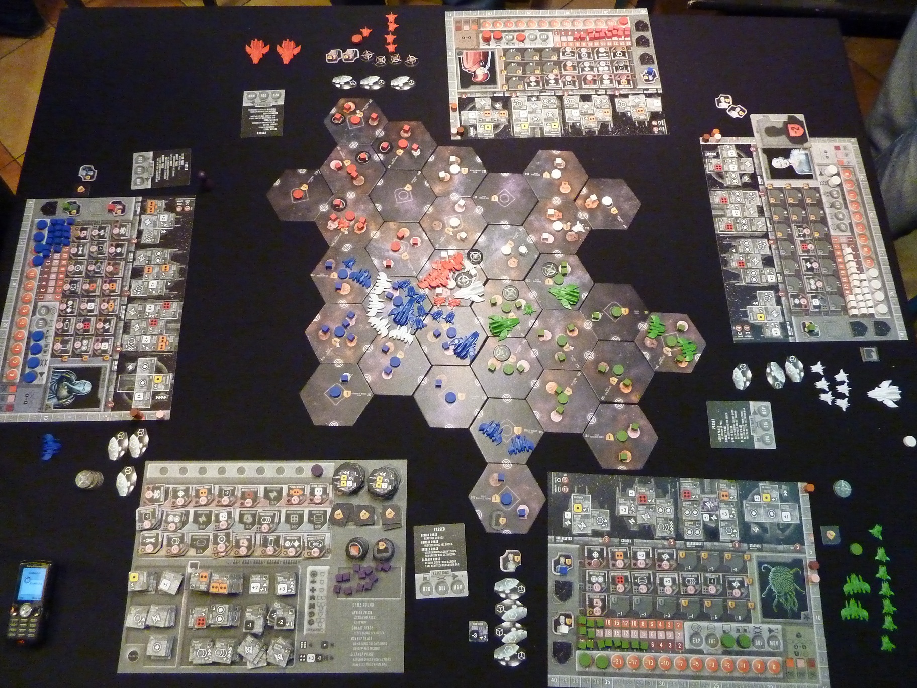 per daug nesiplečiant :) Buvo organizuota antroji naujokų apmokymo sesija. Reikia pažymėti, kad ši partija užtruko gera valanda trumpiau nei pirmoji. Taisyklių aiškinimas užtruko apie 1val 10min. Pradžiai visi tyrinėjo naujas sistemas. Kai kuriems labai "sekėsi" traukt planetų sistemas su senoviniais laivais, kas savaime nėra labai blogai jei su saiku. Tomas sėkmingai rinkosi reikalingas technologijas ir 3io ar 4o roundo pabaigoje paėmė visatos centrą. Toliau praktiškai vykdė gynybos stiprinimo taktiką, buvo sudaręs diplomatinius sąntykius su Aiste ir vėliau su Minddaugu skersai stalą. Per visą žaidimą nepralaimėjo nei vieno mūšio tačiau būdamas itin taikaus būdo nukariavo tik vieną svetimą sistemą paskutiniame rounde. Mindaugas itin plėtėsi į plotį ir paskutiniam rounde galėjo laisvai aplenkti lyderį, nušluodamas Roko sistemas su monumentais, tačiau nepasiskaičiavo kad reikia turėti laisvų įtakos žymeklių kad juos perimti. Grubi naujoko klaida :) Tagi vietoj to kad pasilikti laisvų žymeklių, sulaužęs sąjungą desperatiškai kibo Tomui i gerklę - žinoma nesėkmingai :) O juk gerai sužaidus Mindaugas galėjo paskutiniam rounde paimti garantuotus 8is taškus. Na buvo kaip buvo... Artūras/Amigo pradžioje silpnai pradėjęs, vėliau pasiėmė oranžinės žvaigždės technologiją ir pradėjo kalt rimtą pinigą, kelti grėsmę Aistei ir Tomui. Deja pagrindinė Artūro problema, kad neturėjo jokios rimtesnės puolamosios ginkluotės ir rideno tik geltonus kauliukus. TIk pačiam paskutiniam rounde žaidime pasirodė raudona antimaterijos technologija daranti 4 žalos. Taigi paskutinis roundas Arturui buvo absoliučiai neigiamas nepaisant įsigytos raudonos technologijos. Iš vienos pusės Aistė puolė sukaupusi jėgas, iš kitos pusės grand mūšis su Tomu. Aistė žaidimo eigoje ne itin vystė technologijas, tad Artūras kone grąsino nušluoti nuo lentos, tačiau paskutiniais roundais Aistė sugebėjo atsikovoti pozicijas. Saigūnas nesėkmingai rideno kaulus kovoje su senoliais. Manyčiau tai ir buvo esminė klaida, nes laivai nebuvo gerai paruošti šiai kovai. Rokas praktiškai save izoliavęs nuo kitų žaidėjų pasirinko teisingą taktiką statyti monolitus. Tačiau labai suklydo pernelyg įtikėjęs diplomatinių sąntykių tvirtumu su Mindaugu. Deja monolitai buvo per gardus kąsnelis kuriam Mindaugas neatsilaikė ir paėmė išdaviko kortelę :) Rokui reikėjo būtinai apsaugoti savo frontinį hexą, to nepadarius teko skaudžiai sumokėti - prarasti visi monolitai su sistemomis - minimum 12 taškų. Galutinis rezultatas: