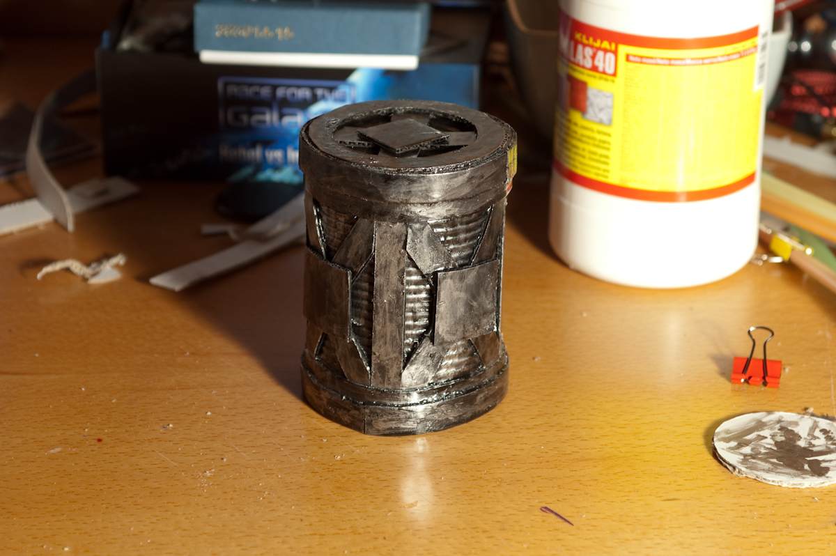 Elementarus, per valandą padaromas dalykas. Reikia tik skardinės, popieriaus, PVE klijų (lipalo), juodų dažų ir šiek tiek sausam dažymui kokio nors metalinio ar pilko atspalvio dažiuko.