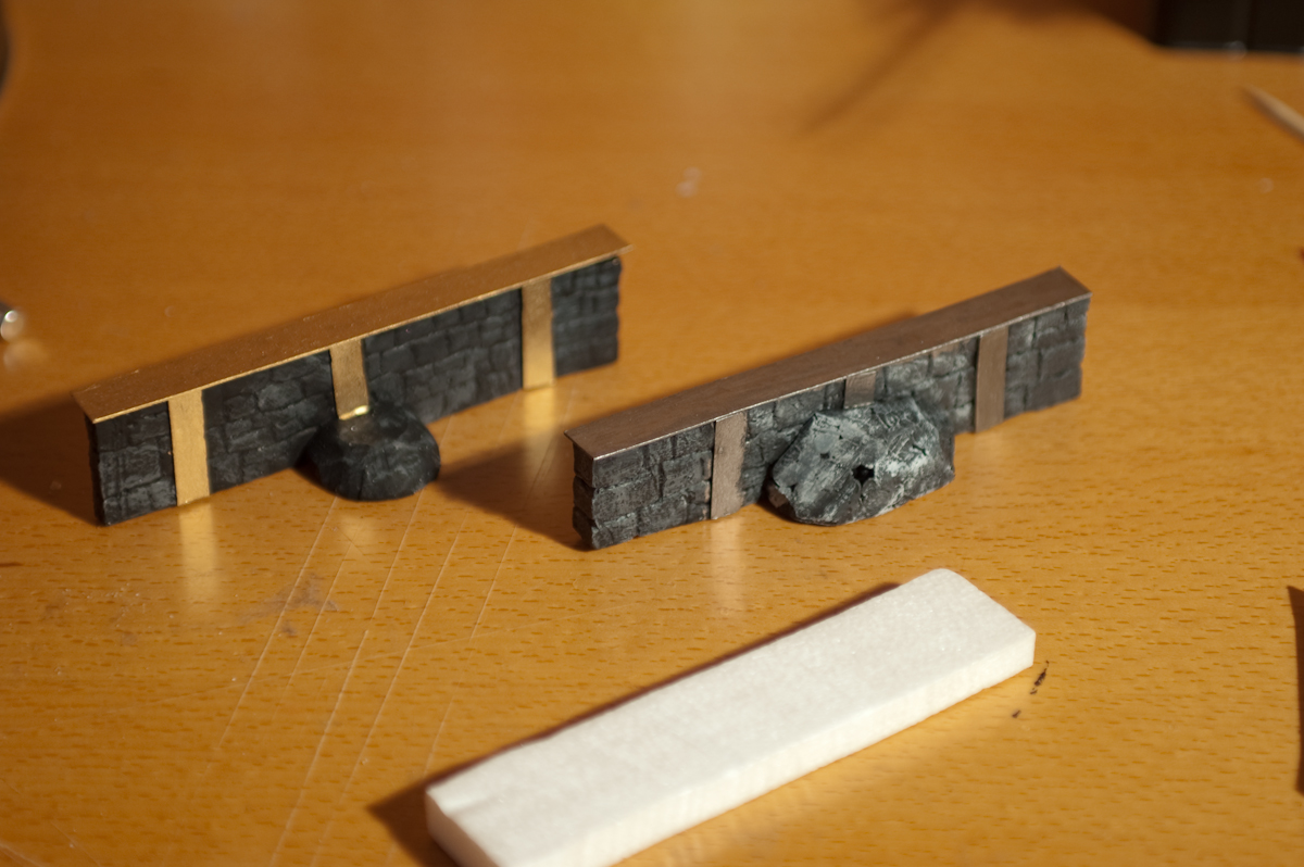 Pavyzdys keleto pirmų sienos variantų, padarytų iš ganėtinai grūdėto putų polisterolo, kuriame išraižomi akmenų kontūrai (gan giliai), viskas užtepama 60 prie 40 klijų ir vandens santykio sluoksniu. Po to iš popieriaus padaromi metalo imitaciniai gabaliukai, jie suklijuojami. Beleika tvorą įstatyti į kokį nors gabaliuką (akmens ar tai žemės), nudažyti ir viskas.