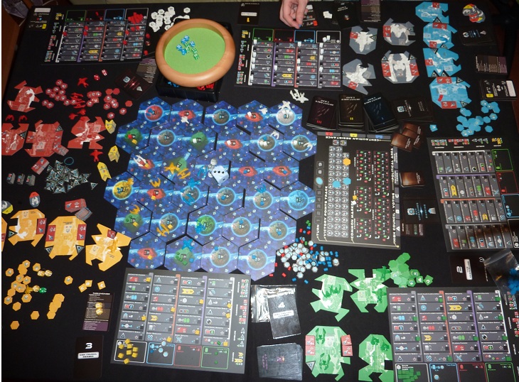 deja dėl užtrukusio starto, Linui teko palikti žaidimą jo viduryje. Rimvydui dar po kelių roundų. Natūralu kad 5 žaidėjų žemėlapyje erdvės buvo tiek jog beveik nekilo jokios konkurencijos, o juk šis žaidimas pagal aprašymus pasižymi nuožmiais mūšiais. Belieka konstatuoti, kad bandymas buvo ganėtinai prisvilęs ir mes toli gražu nepamatėme šio žaidimo potencialo. Del konkurencijos nebuvimo ir neteisingai suprastų taisyklių mes neišbandėm labai svarbios žaidimo dalies, mąsinio naikinimo ginklų, kuriems yra skirta net atskira fazė. Po partijos žaidimą įvertinau 8, tačiau visiškai aišku, kad peržaidus vertinimas tik kils