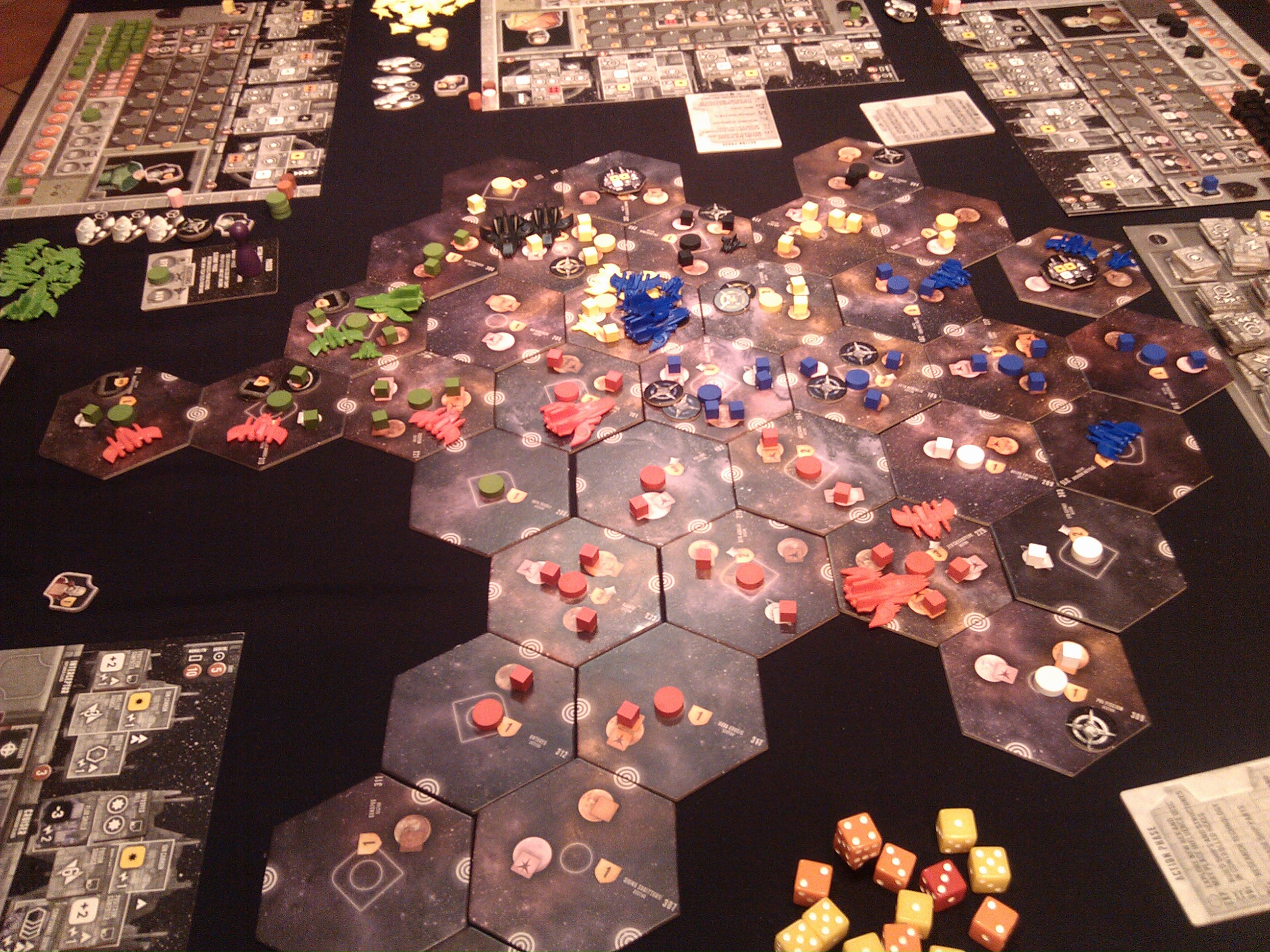 Sužaidžiau gynybinio profilio partiją. Jau matydamas startines rases ir turėdamas tikslą vystyti technologijas nusprendžiau, kad taika su visais man visai priimtina. O tai - nei dau nei mažai - namų hex'o atitikmuo pagal resursų gavybą. Kadangi reikėjo mokslinių planetų, nevysčiau periferijų (III lygio hexų), o ėmiau I ir II. Traukimas buvo labai sėkmingas - jokių ateivių + mokslas. Kaip ir buvo viskas aišku nuo pradžių. Reikėjo tik sumažinti interesą visiems laužyti su manim taiką, taigi vienas kitas erdvėlaivis buvo būtinas